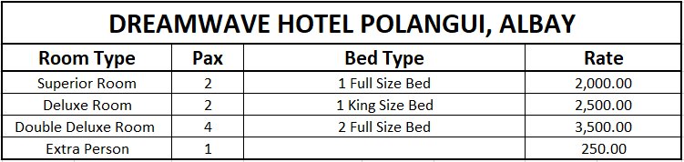 Good for two (2) persons. Inclusive of 2 (two) bottled water with 2 (two) coffee and toiletries with fresh towels every day. Fully air conditioned room with flat screen cabled TV, hot and cold shower and accessible Wi-Fi connection even in public areas. Additional fee of 250.00 for additional extra person. Additional fee of 500.00 for extra mattress.